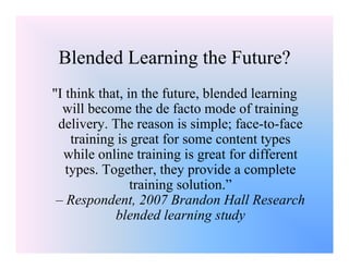 The document discusses the future of blended learning as an effective training approach that combines online and face-to-face instruction to enhance learning experiences. It emphasizes the benefits of blended learning, including faster, cheaper, and more effective training tailored to various learning styles. Additionally, it covers best practices, tools required for implementing blended learning, and a case study from Cabela's University that highlights their blended learning programs and partnerships.