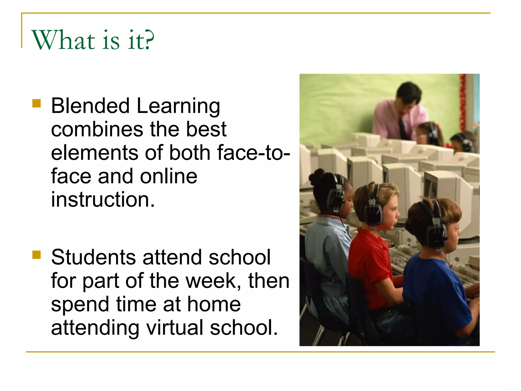 Blended learning combines elements of both traditional in-person instruction and online learning. It allows students to learn partially at school and partially online at home. This approach provides benefits from both models by letting students learn at their own pace online, while still allowing for interaction with teachers and peers in a classroom setting. Blended learning can take various forms, including students attending school part-time and learning online the rest of the week, using computer labs at school for supplemental online courses, or fully integrating online learning into the curriculum at a traditional school.