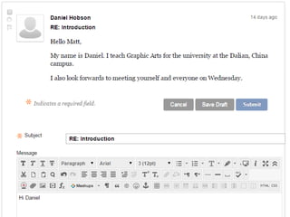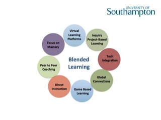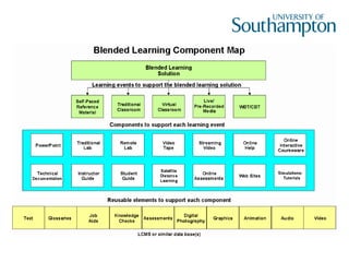 This document discusses various tools in Blackboard that can assist with blended learning approaches. It describes features like avatars, global navigation, notifications, mobile apps, gamification tools, discussion boards, wikis, learning objects, adaptive release, assessments, and the retention center. The tools are mapped to different learning behaviors like constructivism and socially situated learning. Screenshots and links are provided to explain how each tool works.