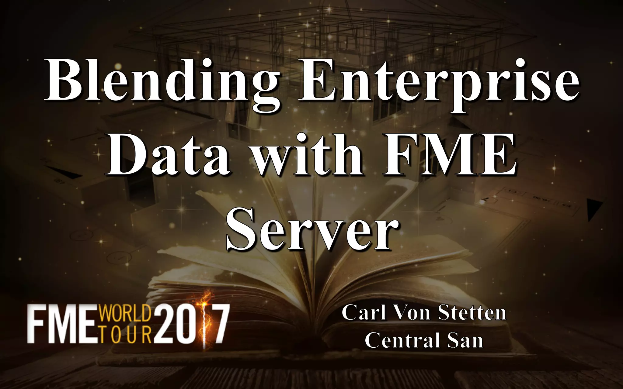 The document discusses the integration of enterprise data into GIS systems, focusing on various database management systems (DBMS) and types of data such as CCTV and sewer management. It highlights the challenges associated with cross-database joins, data inconsistencies, and the need for effective blending of enterprise data into GIS features for improved usability. The author outlines processes using FME Server to create junction tables and publish blended geodatabases, enhancing access to comprehensive data through GIS platforms.