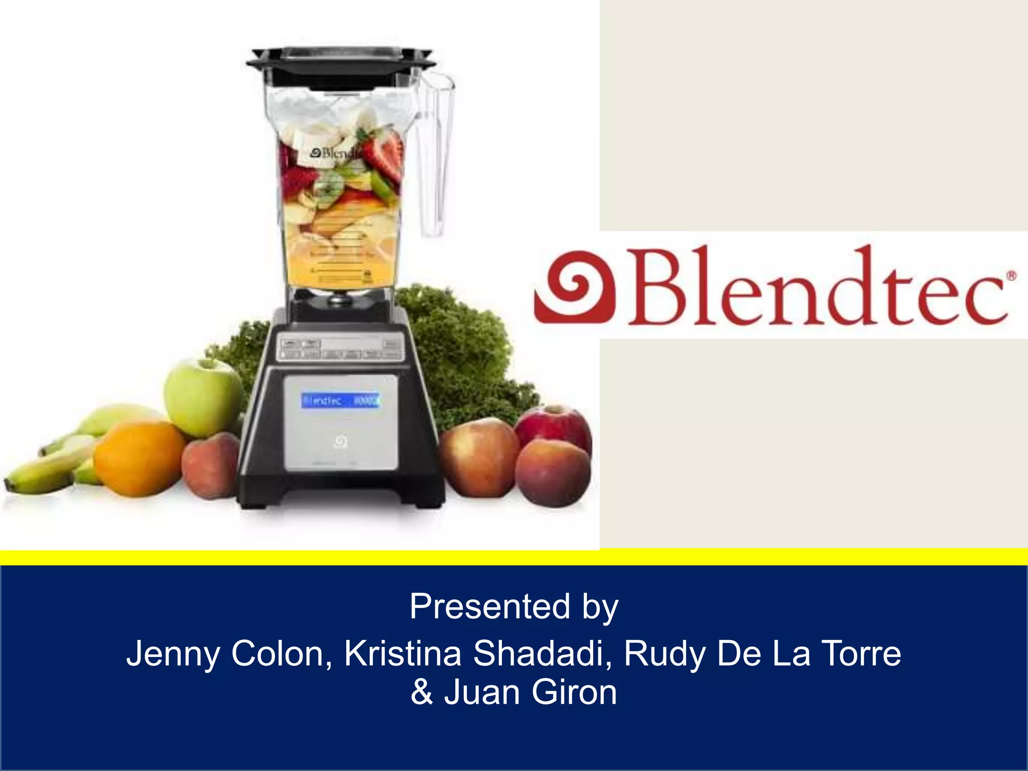 This document summarizes a sales presentation for Blendtec blenders to Amazon buyer Mitch Sebolsky. It includes an agenda, introduction of the sales team, product description and benefits, customer profile for Blendtec, marketing and sales plans, competitive analysis comparing to Ninja and Vitamix blenders, and a proposition for a 90 day trial of 1,000 units with suggested pricing and potential profit margins.