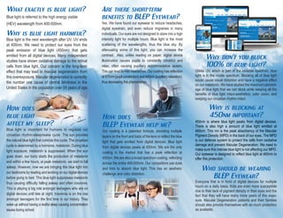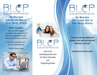 BLEP eyewear is designed to protect against harmful blue light emitted from digital devices, which can lead to long-term eye damage and macular degeneration. The eyewear blocks blue light at 450nm, balancing visual clarity and protection while reducing symptoms like headaches and digital eyestrain. It is recommended for anyone using digital devices for extended periods, especially children and those with a history of macular degeneration.