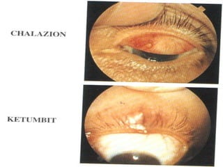 Dokumen ini membahas berbagai jenis kondisi mata terkait blepharitis, stye, dan chalazion, beserta manifestasi klinis dan pengelolaannya. Blepharitis dapat menyebabkan kelopak mata merah dan berkerak, sementara stye ditandai dengan abses di folikel bulu mata. Chalazion merupakan inflamasi kronik yang membutuhkan pengelolaan baik secara lokal maupun pembedahan jika sering berulang.