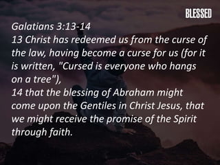 Galatians 3:13-14 highlights Christ's redemption from the curse of the law, becoming a curse for humanity to enable the Gentiles to receive Abraham's blessing and the promise of the Spirit through faith. The document references Deuteronomy to illustrate the consequences of the curse, which includes various forms of suffering and failure. Additionally, it emphasizes the blessings associated with faith in Christ, including spiritual blessings and a restored relationship with God.