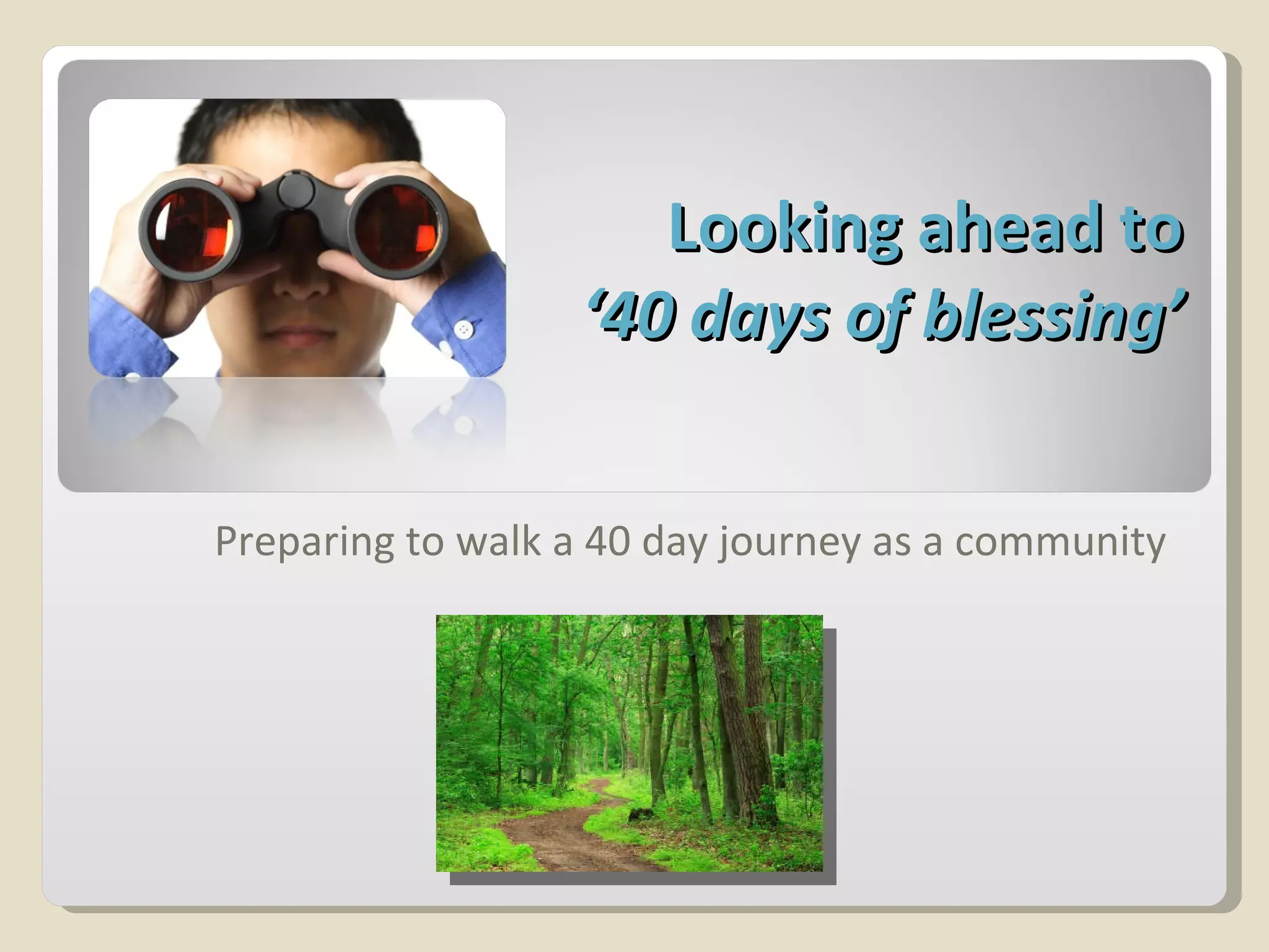 The document discusses the concept of blessing from God's perspective. It explains that God's blessing is unconditional but not automatic, and comes from developing a relationship with God and having the right perspective of putting Him first. It encourages taking time to wait on the Lord to renew strength, and expresses gratitude to God. It also discusses how blessing others through kindness and service allows one to experience God's blessing daily.