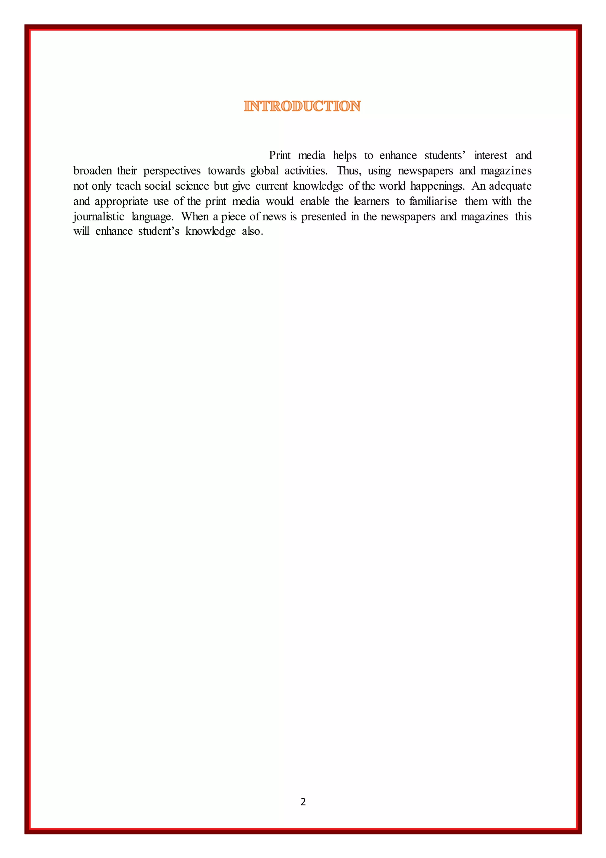 1. The document discusses the importance and effective use of print media like newspapers and magazines in social science learning. It notes how print media can enhance students' interests, broaden their perspectives, and provide current knowledge of world events.