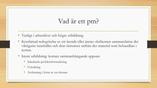 #3 OBS! Att skriva ett PM handlar sällan bara om att återge innehåll i ett antal källor rakt upp och ner. Skribenten måste bearbeta och värdera källor kritiskt, jämföra dem och diskutera olika anfallsvinklar på ämnet.