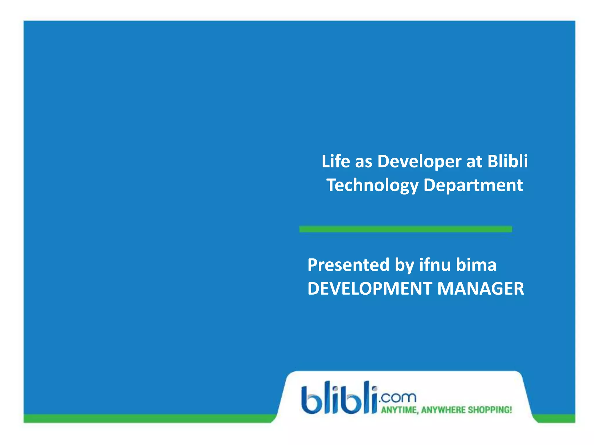 This document summarizes a presentation about working as a developer at Blibli. It discusses the presenter's background, Blibli's internship and hiring process, and how Blibli manages product development. The presentation outlines Blibli's product management approach including defining the right product, building it correctly, and focusing on people and culture. It also describes Blibli's agile development process using Scrum, the tools used like AngularJS and Git, and how development teams are organized at Blibli's Technology Department.