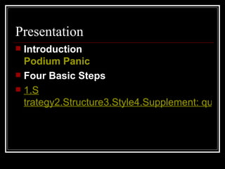This document provides information on conducting a blind taste test presentation and summarizes the results. It outlines four basic steps for presentations: strategy, structure, style, and supplementing with questions and challenges. It also includes an evaluation form to rate group presentations on introduction, organization, content, visual aids, conclusion, delivery, discussion, and overall rating. The document states that results from a survey or questionnaire on the blind taste test should be provided, a point should be made, and the validity of the results discussed. It concludes by stating a wrap-up of the presentation should answer any questions and suggest areas for more research.