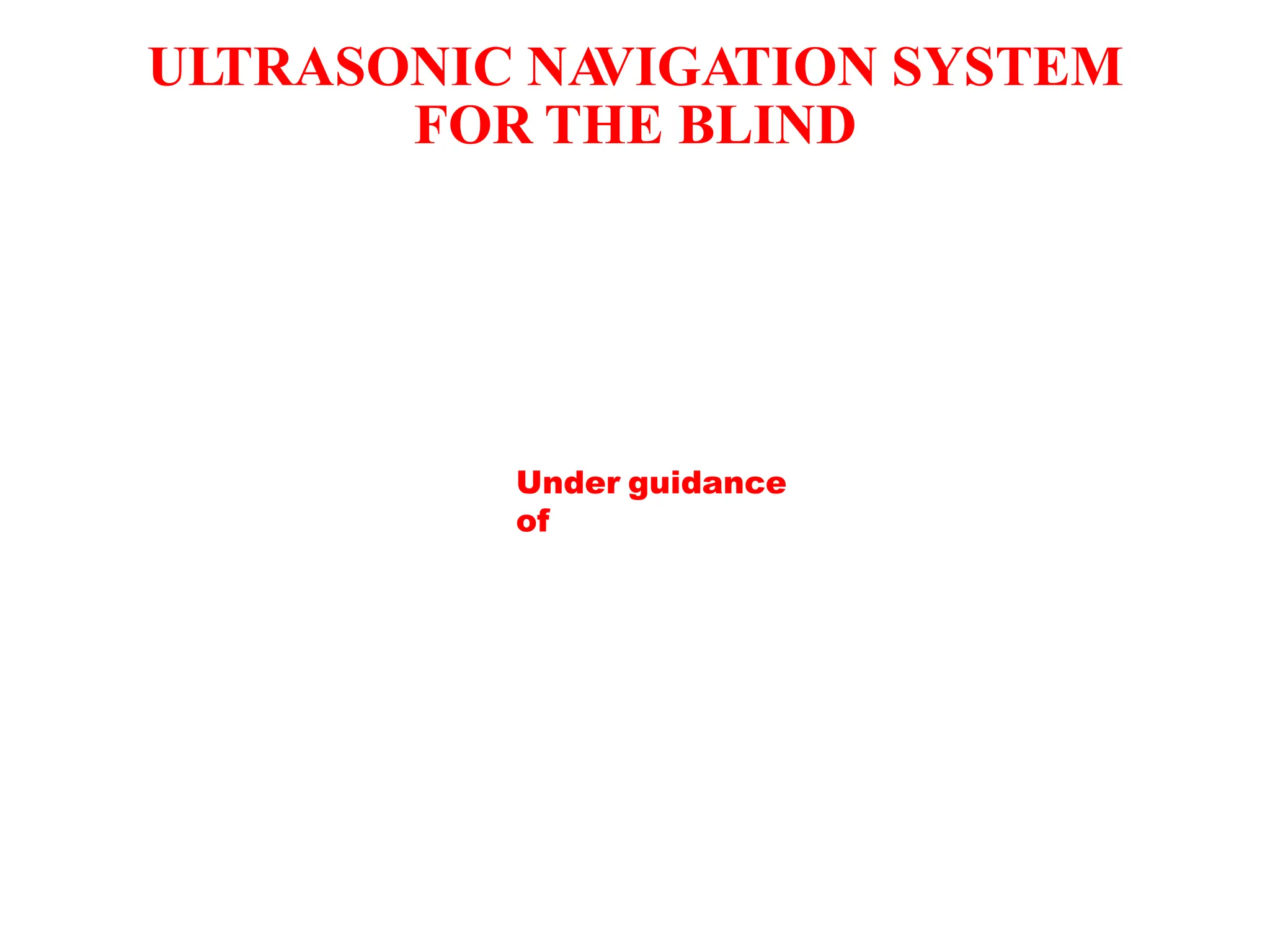 This document describes an ultrasonic navigation system to assist blind people. It contains sections on the introduction, basic logic, components, prototype, sensors including ultrasonic, IR and water, microcontroller ATmega16, output devices including buzzer and vibrator, software, interfacing, conclusion and future scope. The system uses various sensors interfaced with a microcontroller to detect obstacles and provide alerts to the blind user via vibrations to help navigate safely.