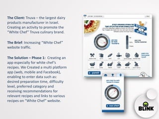 This document outlines several digital marketing campaigns conducted by the agency. It describes campaigns for various clients including Tnuva dairy products, YesTV broadcaster, Haaretz newspaper, and new "Yolo" dairy chocolate. For Tnuva, the agency created a recipe app and content platform to increase traffic to their "White Chef" website. For YesTV, they developed a meme generator app to promote the new season of "Game of Thrones". And for Haaretz and "Yolo", they created viral apps and influencer campaigns to boost reach and engagement among online users.