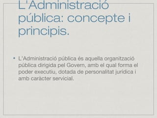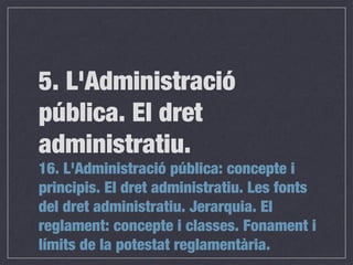 L'Administració pública: concepte i principis. El dret administratiu. Les fonts del dret administratiu. Jerarquia. El reglament: concepte i classes. Fonament i límits de la potestat reglamentària.