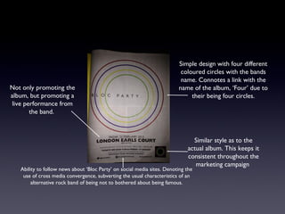 This advertisement promotes both a new Bloc Party album titled "Four" and an upcoming live performance by the band. It features four differently colored circles representing the four tracks on the album in a simple, consistent style that builds the band's branding. The advertisement also directs fans to follow Bloc Party's social media for news, subverting the typical alternative rock band's aversion to fame.