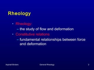 This document discusses the fundamentals of rheology and describes various types of rheometers used to measure the rheological properties of asphalt binders. It explains that rheology is the study of flow and deformation and introduces constitutive relationships between force and deformation. It then describes different types of rheometers, including shear rheometers that apply drag or pressure-driven flows, and other rheometers that measure stiffness and strength through bending beam or direct tension tests. Specific examples of equipment are also shown, such as concentric cylinder and parallel plate shear rheometers, a bending beam rheometer, and a direct tension testing device.