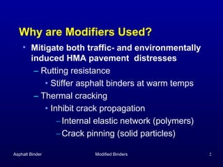 This document discusses modified asphalt binders, which are used to improve the performance of asphalt pavements. Modifiers such as polymers and fillers are added to asphalt binders to increase rutting resistance at warm temperatures and inhibit cracking from traffic and environmental stresses. The document describes different types of modifiers and provides examples of polymeric modifiers. It also discusses traditional testing methods for modified binders and uses microscopy images to illustrate how polymers interact within asphalt binders.