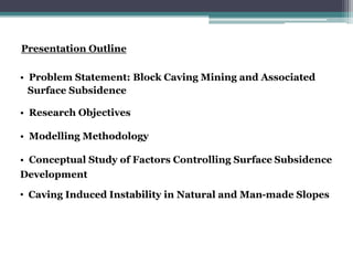 The document discusses numerical modelling of surface subsidence associated with block cave mining. It presents the research objectives, which include developing a new methodology using finite-discrete element modelling (FEM/DEM) to analyze subsidence. The modelling methodology incorporates rock mass properties derived from classification systems. Conceptual studies examine factors controlling subsidence development such as joint orientation. The results could improve understanding of subsidence mechanisms and enhance prediction capabilities.