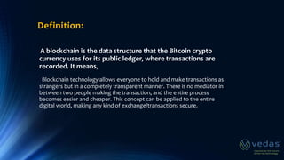 Blockchain technology allows for transparent and secure transactions without an intermediary. It has various applications including financial services, smart contracts, IoT, and more. Key benefits are security, transparency, low costs, and reduced time. Blockchain functions by recording transactions in blocks that are linked using cryptography. Programming languages like Java and frameworks like Ethereum and Hyperledger can be used to develop blockchain applications. Databases can also integrate blockchain features to provide a scalable solution for deploying blockchain proofs-of-concept, platforms and applications.