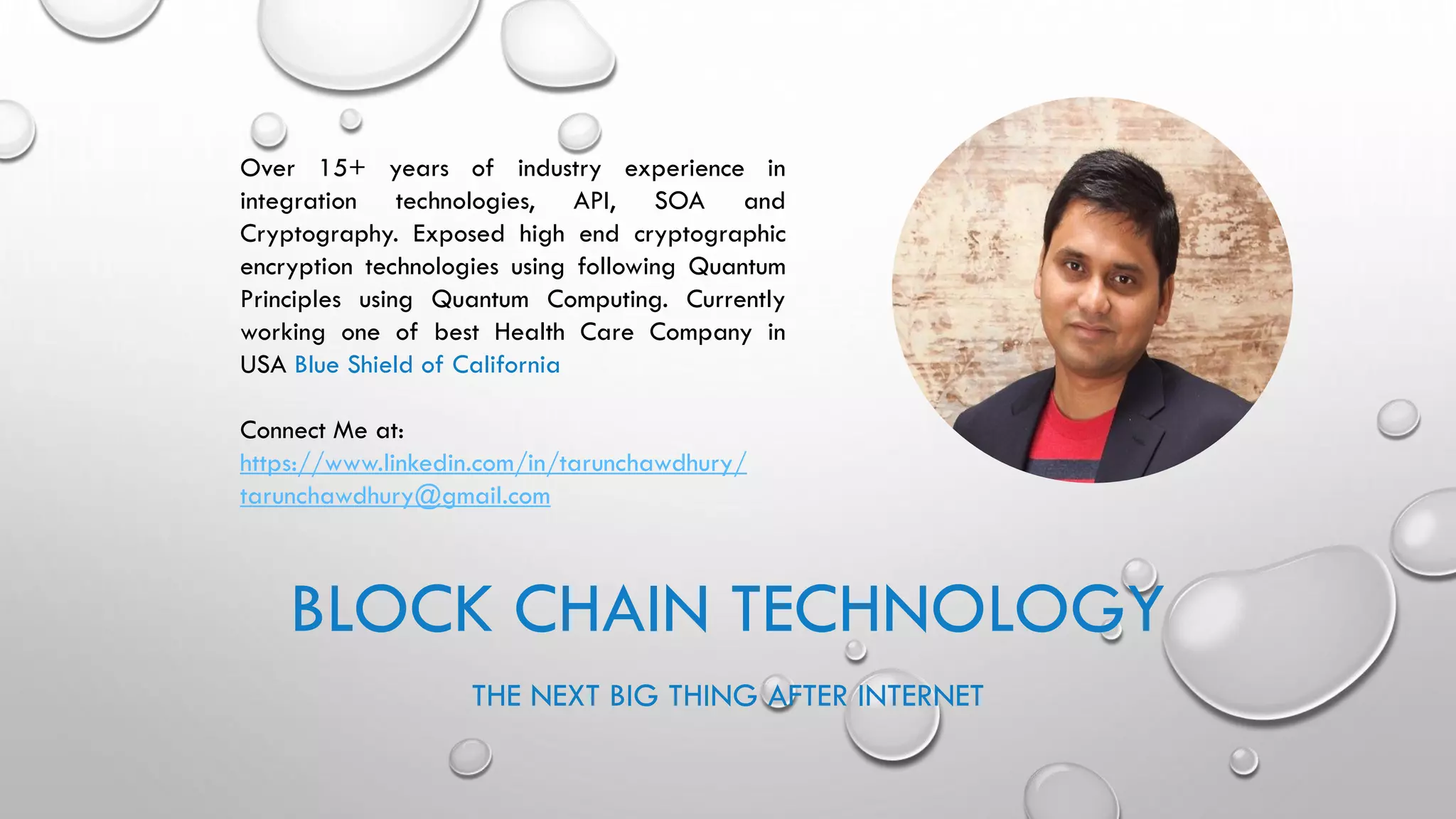 Blockchain technology allows for direct peer-to-peer transactions without intermediaries by maintaining an immutable distributed digital ledger. It solves issues like slow settlement, high costs, and lack of trust between transacting parties through automation and cryptography. Each participant holds an identical copy of the blockchain, which consists of blocks of validated transaction data linked together. A new block is only added when a majority of participants reach consensus, preventing hacking of the immutable record. Potential applications beyond digital currencies include land titles, micropayments, and electronic health records.