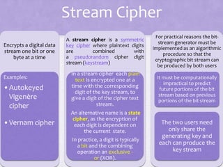 1. The document discusses network security and provides details about stream ciphers and block ciphers. It explains how each type of cipher works and provides examples of each.