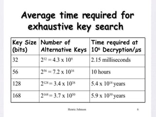 2. Details are given about the Feistel cipher structure and how it provides diffusion and confusion through repeated rounds. The Data Encryption Standard (DES) algorithm is described as a prominent example of a Feistel cipher.