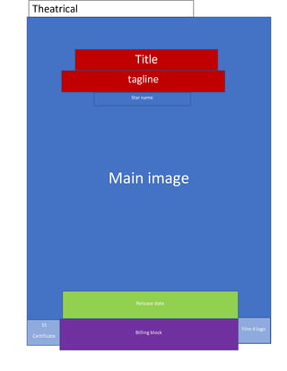 This document contains information about an upcoming film release, including the title, tagline, certificate rating, release date, distributor logo, and billing block listing the main star. Images and formatting are included to showcase how this information would appear on marketing materials like posters, trailers, and listings.