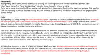 Block printing has a long history originating in East Asia over 4,000 years ago. The earliest known example of block printing was done in China before 220 CE on silk cloth. The technique later spread throughout Asia and the world. The process involves carving designs and patterns onto wooden blocks which are then pressed onto fabric along with pigment dyes to create colorful prints. It is a labor intensive and time-consuming process requiring artistry and skill. Major centers of traditional block printing include India, China, Japan and communities still practice this centuries-old art today.