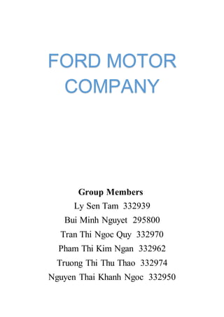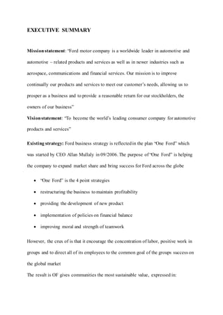Ford Motor Company: Outlines Ford's mission to meet customer needs and provide returns for shareholders. The vision is to become the world's leading automotive company. The "One Ford" strategy aims to expand market share globally through restructuring, new products, financial policies, and teamwork. Ford produces cars, trucks, SUVs, and Lincoln luxury vehicles. It faces competition from Toyota, GM, Chrysler, Honda, and Nissan in the US and Volkswagen, PSA, Renault, GM, and Fiat in Europe.