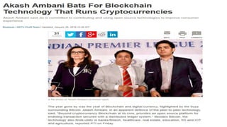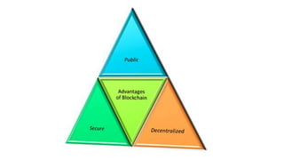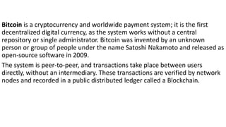 Bitcoin is a cryptocurrency and decentralized payment system that was created in 2009 by an unknown person under the name Satoshi Nakamoto. Transactions occur directly between users without an intermediary and are recorded on a public distributed ledger called the blockchain. New bitcoins are generated by miners who verify transactions and are rewarded with new bitcoins. The blockchain records all transactions and grows continuously as new blocks are added, allowing anyone to trace transactions back to the original creation of bitcoins.