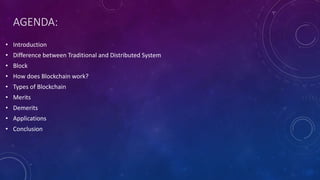 This document discusses blockchain technology. It begins with defining blockchain as a decentralized digital ledger that records transactions across many computers. It then explains that a block is the current part of the blockchain that records all transactions as a permanent database. It describes how blockchain works and the different types including public, private, semi-private, and shared blockchains. It outlines some of the merits and demerits of blockchain technology and discusses potential applications. It concludes that blockchain is still an emerging technology that will transform how society functions as applications continue to be experimented with and developed over the next few years.