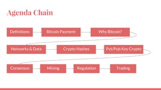 The document provides definitions and explanations of key concepts related to blockchain technology and cryptocurrencies like Bitcoin. It discusses how blockchain works as a distributed ledger using cryptography and consensus to allow decentralized transactions without intermediaries. It also addresses common questions around how Bitcoin transactions are validated and added to the blockchain through mining processes.