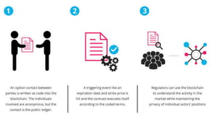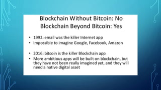 The document provides an overview of blockchain and cryptocurrency. It begins with a brief history of cryptocurrency starting in the 1980s with early digital currency attempts. Bitcoin was introduced in 2009 by Satoshi Nakamoto as the first cryptocurrency based on blockchain technology. Blockchain works by distributing a ledger across a network of computers, making it difficult to hack. New transactions are verified and added to blocks that are chained together using cryptography. Miners use computing power to verify transactions and are rewarded with cryptocurrency. The document discusses the rise in value of bitcoin and potential opportunities for real estate buyers with large holdings of cryptocurrency. It also mentions other applications of blockchain technology beyond currency.