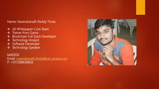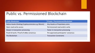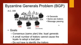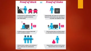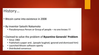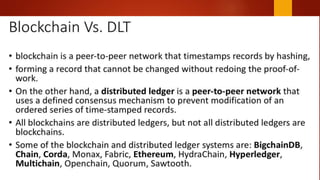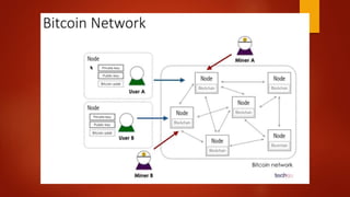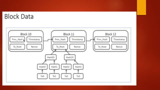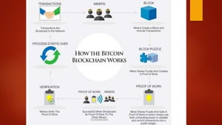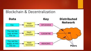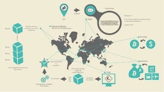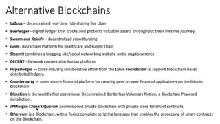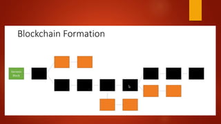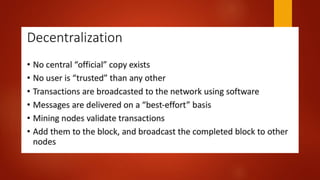 Blockchain is a decentralized ledger or list of all transactions across a peer-to-peer network. It underlies technologies like Bitcoin and has potential to disrupt many business processes. No single user controls the blockchain, transactions are broadcast to the network and validated through consensus. The author of the blockchain concept is unknown, thought to use the pseudonym Satoshi Nakamoto. Blockchains use techniques like proof-of-work to serialize changes and achieve distributed consensus to maintain integrity without centralized authority.