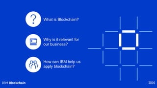 Blockchain is a shared, immutable ledger that can record transactions and track assets in business networks. It allows companies to share records and establish trust without the need for a central authority. IBM's blockchain platform uses Hyperledger Fabric to develop applications that provide benefits like reduced costs, improved traceability and data sharing between organizations. It can help industries like finance, supply chain and healthcare by creating transparency and efficiency in business processes.