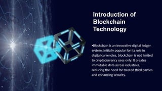 Blockchain technology is a decentralized digital ledger system that enhances security and reduces the need for third parties across various industries, initially gaining popularity through cryptocurrencies. It provides applications in healthcare, supply chain management, and finance by improving efficiency and transparency. Despite challenges like scalability and energy consumption, advancements such as decentralized finance and interoperability promise a promising future for blockchain adoption.