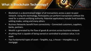 Blockchain technology allows for decentralized transactions across a peer-to-peer network without a central authority. It uses a distributed ledger to record all transactions in blocks that are linked through cryptography. This provides transparency and immutability. Potential applications of blockchain include financial transactions, supply chain management, digital voting, and smart contracts. Some key advantages are transparency, reduced costs, faster settlements, and decentralization.