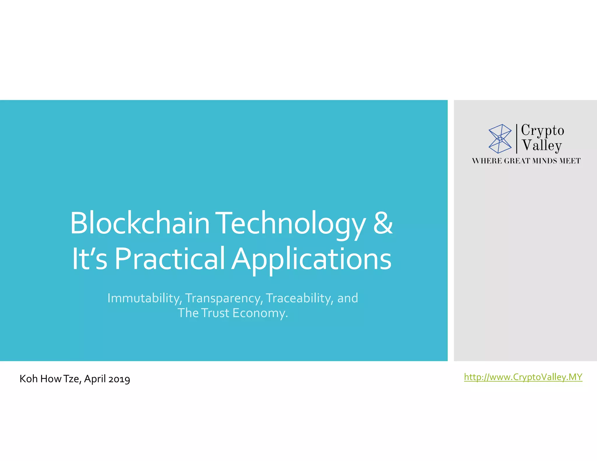 The document discusses blockchain technology and its practical applications, emphasizing its features such as immutability, transparency, and traceability. It highlights various use cases across different sectors, including finance, government, healthcare, and supply chain management. The overarching theme is that blockchain will significantly transform how society agrees, trusts, and conducts transactions.
