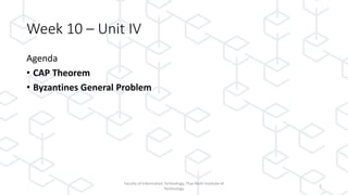 The document discusses concepts related to blockchain technology, specifically the CAP theorem and the Byzantine Generals Problem, as presented in a lecture by Dr. Ferdinand Joe John Joseph at the Thai-Nichi Institute of Technology. The CAP theorem states that in a distributed database, only two of the three guarantees (consistency, availability, and partition tolerance) can be met at the same time, while blockchain focuses on availability and partition tolerance with some level of consistency. Additionally, the Byzantine Generals Problem illustrates the challenges of achieving consensus in distributed systems, applying this to blockchain's mechanism where all nodes must reach agreement despite potential corruption.