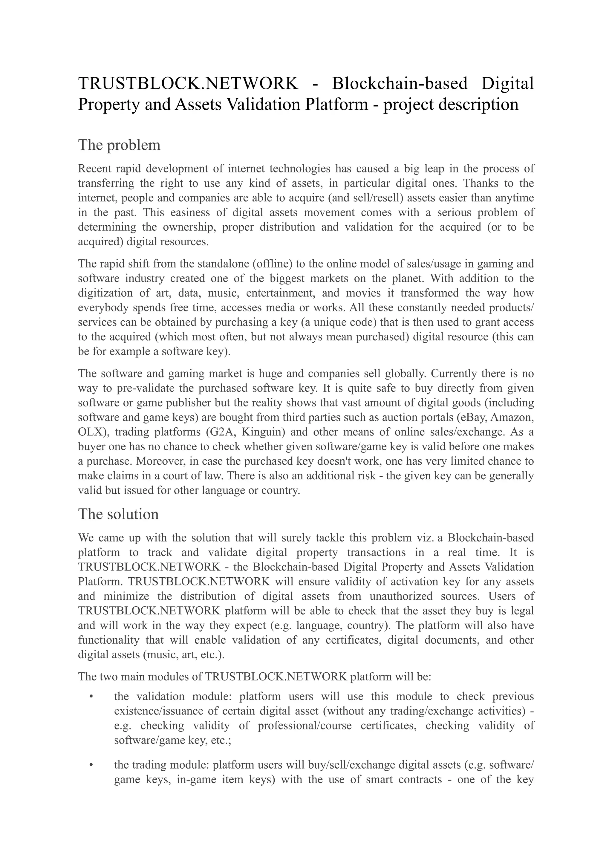 TRUSTBLOCK.NETWORK is a blockchain-based platform that aims to solve the problem of validating ownership and proper distribution of digital assets such as software keys, game keys, digital art, and certificates. The rapid growth of online markets for digital goods has made it difficult to determine if a purchased key is valid. TRUSTBLOCK.NETWORK will allow users to check the validity of digital assets before purchase using a validation module. It will also facilitate the buying, selling, and exchanging of digital assets through a trading module using smart contracts to validate each transaction. The platform seeks partnerships with software and game publishers to help control the distribution of their digital goods and provide users assurance when purchasing assets.