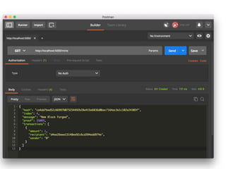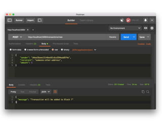 The document discusses building a private blockchain. It begins with prerequisites for setting up Python, Flask, and other tools. It then provides an overview of key blockchain concepts like distributed ledgers, blocks, hashes, and proof of work. The document outlines steps to create a blockchain including building the class, adding transactions to blocks, creating new blocks with proofs, and hashing blocks. Code examples are provided for initializing the blockchain and adding new transactions and blocks to the chain.