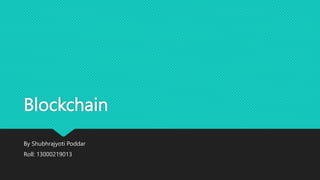 Blockchain is a decentralized ledger of transactions across a peer-to-peer network that allows participants to perform transactions without a central authority. It provides transparency, reduced costs, faster transaction settlements, and decentralization. The first blockchain application was Bitcoin, a digital currency that ensures secure "cash-like" coin passing in an immutable and final manner. Potential applications of blockchain include money transfers, smart contracts, electronic voting, and paying employees.