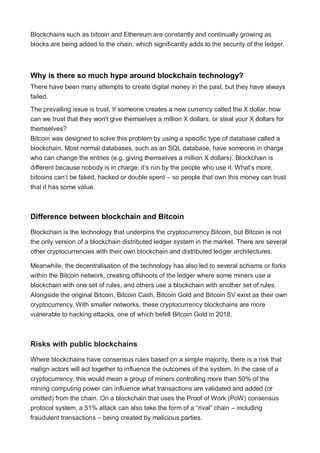 Blockchain is a distributed digital ledger that records transactions across a peer-to-peer network in a way that is immutable, transparent, and secure. It allows transactions to be recorded without a central authority by distributing the ledger across the entire network. Each transaction is grouped into blocks that are cryptographically linked together in a chain. The decentralized nature of blockchain makes it difficult to hack or corrupt the ledger. While blockchain first emerged with Bitcoin, the technology can be applied beyond cryptocurrencies to provide trust and transparency to other types of transactions.