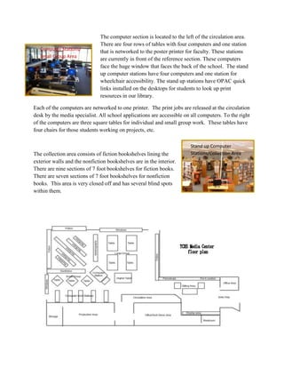 The media center at Tattnall County High School serves over 900 students and 91 faculty members. It has various sections including a circulation desk, office, work room, periodical section, large group area, computer stations, and collection area. While the physical space provides an attractive environment for learning, the document notes several areas for improvement, such as making the collection area more open and adding a quiet space. It also states that the virtual learning commons is lacking and does not meet best practices as outlined by Loertscher, such as having information, literacy, knowledge building, experimental learning, and school culture centers. The document recommends improvements to the virtual learning commons to better connect students and the community to resources and allow for