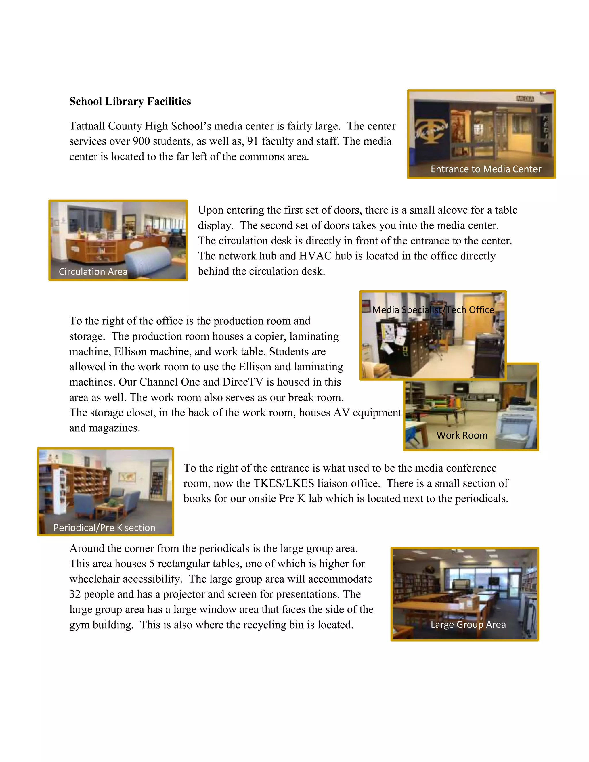 The media center at Tattnall County High School serves over 900 students and 91 faculty members. It has various sections including a circulation desk, office, work room, periodical section, large group area, computer stations, and collection area. While the physical space provides an attractive environment for learning, the document notes several areas for improvement, such as making the collection area more open and adding a quiet space. It also states that the virtual learning commons is lacking and does not meet best practices as outlined by Loertscher, such as having information, literacy, knowledge building, experimental learning, and school culture centers. The document recommends improvements to the virtual learning commons to better connect students and the community to resources and allow for