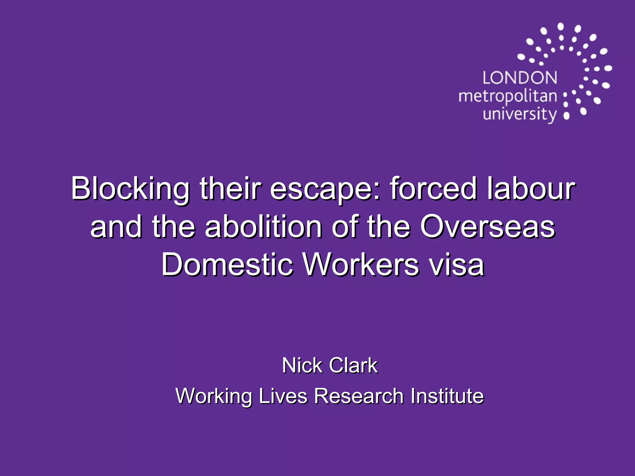The document discusses migrant domestic workers in the UK and issues with the Overseas Domestic Worker visa. It summarizes that migrant domestic workers experience indicators of forced labor such as deception, non-payment of wages, and restrictions on movement. However, they receive limited employment protections under UK law due to exemptions from minimum wage, working time limits, and health and safety inspections in private homes. Removing the ability of these workers to change employers or remain in the country long-term will not eliminate the work but rather drive it further underground without protections.