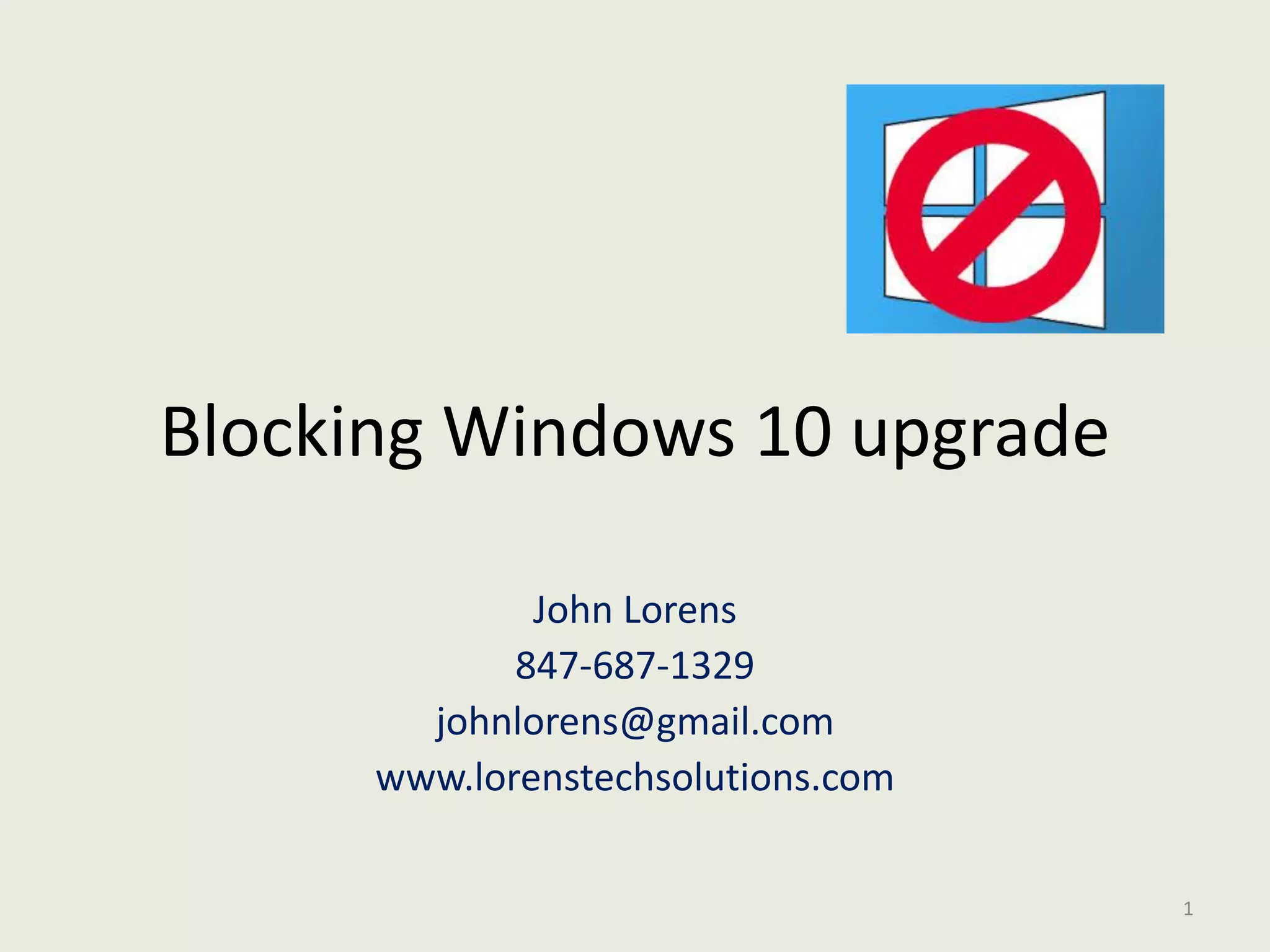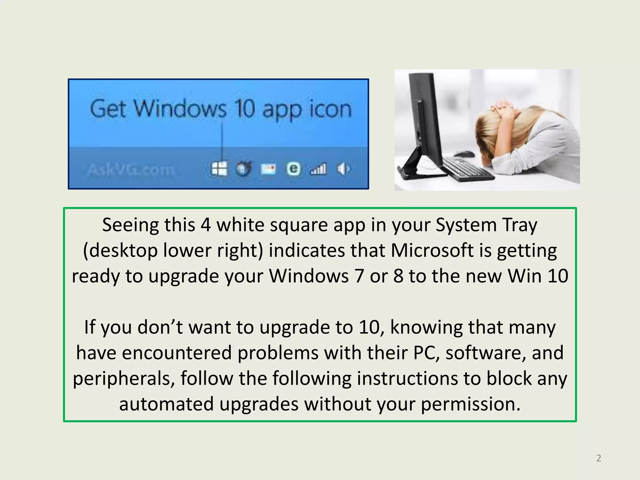 This document provides instructions on how to block the automatic upgrade from Windows 7 or 8 to Windows 10. It outlines steps including adjusting settings in the Control Panel and downloading the GWX Control Panel program to prevent unwanted upgrades. The guide emphasizes the importance of maintaining user control over software updates.