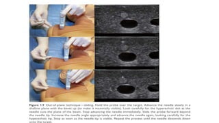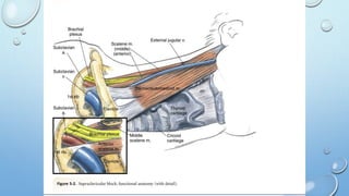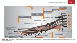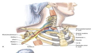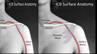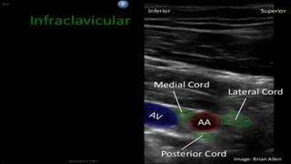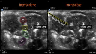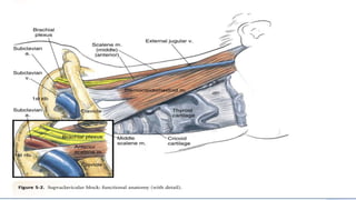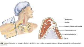 This document discusses regional blocks and pain medicine for the upper limb. It begins with a brief history of regional anesthesia techniques. It then describes various techniques including paresthesia, nerve stimulation, and ultrasound-guided blocks. Specific blocks covered include interscalene, supraclavicular, and intravenous regional anesthesia (Bier block). Advantages and disadvantages of each technique are provided. The document also discusses pharmacological considerations, contraindications, and complications of regional anesthesia in the upper limb.