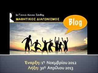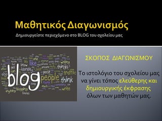 Προκειμένου να δοθεί κίνητρο στους μαθητές μας να συνεισφέρουν και να γεμίσουν με δικό τους πρωτότυπο περιεχόμενο το ιστολόγιο, ο Σύλλογος Διδασκόντων προκηρύσσει Eτήσιο Eνδοσχολικό Mαθητικό Διαγωνισμό καλύτερης ανάρτησης στο σχολικό blog.