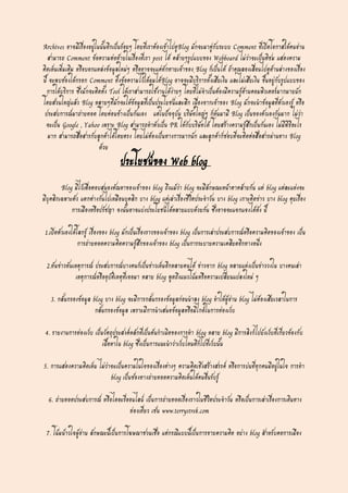มักจะมาคู่กับระบบ Comment ที่เปิดโอกาสให้คนอ่าน สามารถ Comment ข้อความต่อท้ายในเรื่องที่เรา post ได้ คล้ายๆรูปแบบของ Webboard ไม่ว่าจะเป็นติชม แสดงความ คิดเห็นเพิ่มเติม หรือบอกแหล่งข้อมูลใหม่ๆ หรืออาจจะแค่ทักทายเจ้าของ Blog ก็เป็นได้ ถ้าคุณลองเลื่อนไปดูด้านล่างของเรื่อง นี้ จะพบช่องให้กรอก Comment ทิ้งข้อความไว้ให้ผมได้Blog อาจจะมีบริการทั้งเสียเงิน และไม่เสียเงิน ขึ้นอยู่กับรูปแบบของ การให้บริการ ซึ่งมักจะติดตั้ง Tool ให้เราสามารถใช้งานได้ง่ายๆ โดยที่ไม่จาเป็นต้องมีความรู้ด้านคอมพิวเตอร์มากมายนัก โดยส่วนใหญ่แล้ว Blog หลายๆที่มักจะให้ข้อมูลที่เป็นประโยชน์และลึก เนื่องจากเจ้าของ Blog มักจะนาข้อมูลที่ตัวเองรู้ หรือ ประสบการณ์มาถ่ายทอด โดยค่อนข้างเป็นกันเอง แต่ในปัจจุบัน บริษัทใหญ่ๆ ก็หันมามี Blog เป็นของตัวเองกันมาก ไม่ว่า จะเป็น Google , Yahoo เพราะ Blog สามารถทาตัวเป็น PR ให้กับบริษัทได้ โดยสร้างความรู้สึกเป็นกันเอง ไม่มีพิธีอะไร มาก สามารถสื่อสารกับลูกค้าได้โดยตรง โดยไม่ต้องเป็นทางการมากนัก และลูกค้าก็ชอบที่จะติดต่อสื่อสารผ่านทาง Blog ด้วย ประโยชน์ของ Web blog Blog มีไว้เพื่อตอบสนองตัณหาของเจ้าของ blog ถึงแม้ว่า blog จะมีลักษณะหน้าตาคล้ายกัน แต่ blog แต่ละแห่งจะ มีบุคลิกเฉพาะตัว แตกต่างกันไปเหมือนบุคลิก บาง blog แค่เล่าเรื่องชีวิตประจาวัน บาง blog เกาะติดข่าว บาง blog คุยเรื่อง การเมืองหรือปรัชญา จงนั้นอาจแบ่งประโยชน์ได้หลายแบบด้วยกัน ซึ่งอาจจะแจกแจงได้ดัง นี้ 1.เปิดตัวเองให้โลกรู้ เรื่องของ blog มักเป็นเรื่องราวของเจ้าของ blog เป็นการเล่าประสบการณ์หรือความคิดของเจ้าของ เป็น การถ่ายทอดความคิดความรู้สึกของเจ้าของ blog เป็นการระบายความเคลียดอีกทางหนึ่ง 2.ทันข่าวทันเหตุการณ์ ประสบการณ์บางคนก็เป็นข่าวเห็นอีกหลายคนได้ ข่าวจาก blog หลายแห่งเป็นข่าววงใน บางคนเล่า เหตุการณ์หรืออุบัติเหตุที่เจอมา หลาย blog พูดถึงแนวโน้มหรือความเปลี่ยนแปลงใหม่ ๆ 3. กลั่นกรองข้อมูล blog บาง blog จะมีการกลั่นกรองข้อมูลก่อนนาลง blog ทาให้ผู้อ่าน blog ไม่ต้องเสียเวลาในการ กลั่นกรองข้อมูล เพราะมีการนาเสนอข้อมูลหรือมีไกด์ในการท่องเว็บ 4. รายงานการท่องเว็บ เป็นวัตถุประสงค์หลักที่เป็นต้นกาเนิดของการทา blog หลาย blog มีการลิงก์ไปยังเว็บที่เกี่ยวข้องกับ เนื้อหาใน blog ซึ่งเป็นการแนะนาว่าเว็บไหนดีก็ไปที่เว็บนั้น 5. การแสดงความคิดเห็น ไม่ว่าจะเป็นความในใจของเรื่องต่างๆ ความคิดเชิงสร้างสรรค์ หรือการบ่นที่ทุกคนมีอยู่ในใจ การทา blog เป็นช่องทางถ่ายทอดความคิดเห็นให้คนอื่นรับรู้ 6. ถ่ายทอดประสบการณ์ หรือไดอะรี่ออนไลน