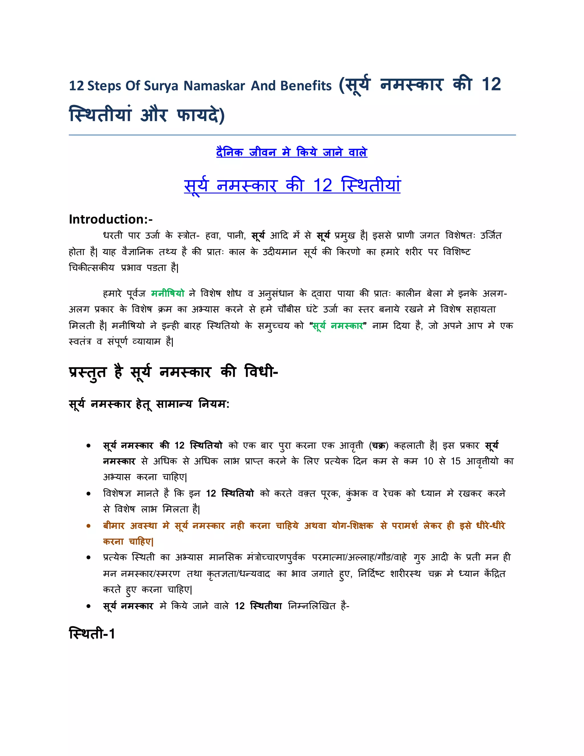 सूर्य नमस्कार मे ककर्े र्ाने वाले 12 स्स्ितीर्ा ननम्नशलखखत है-