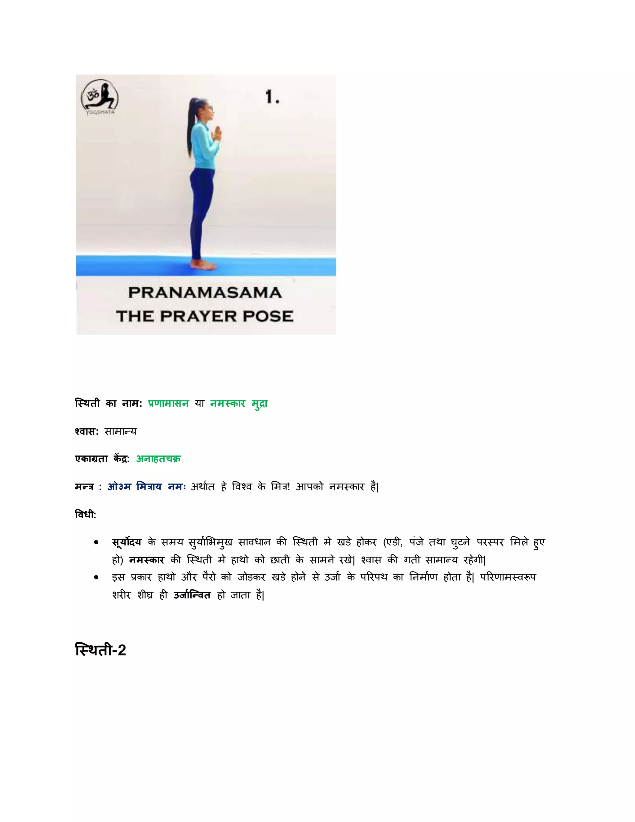 हो) नमस्कार की स्स्िती मे हािो को छाती के सामने रखे| श्वास की गती सामान्र् रहेगी|